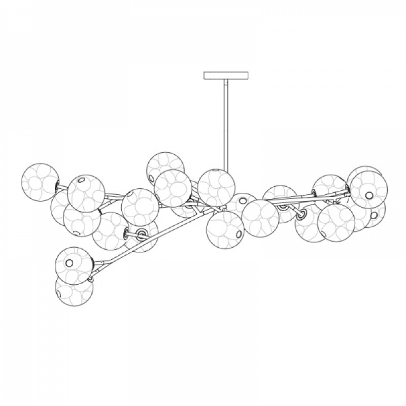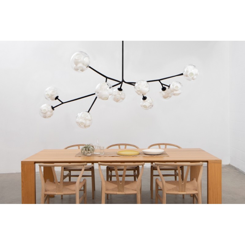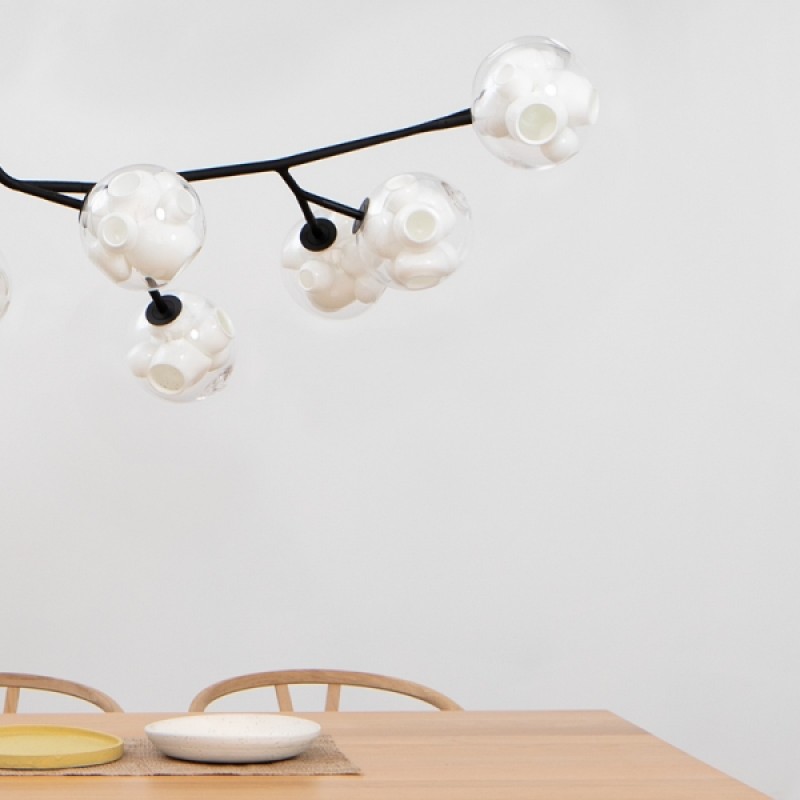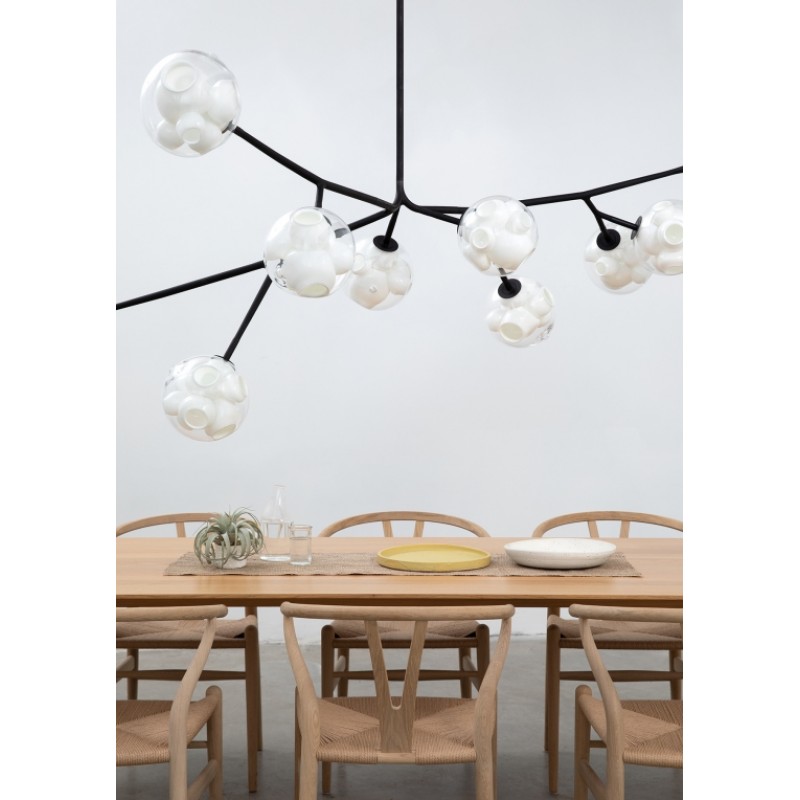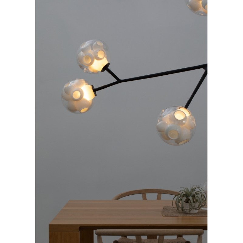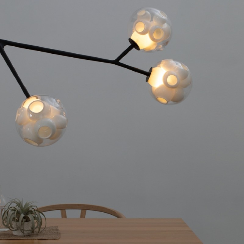 38V is a variant of the original 38 series where a large glass sphere is blown with a multitude of haphazard interior cavities, which intersect and collide in unpredictable ways. 38V is smaller, lighter and suspended with coaxial cables. The interior cavities can be filled with plants or left empty. The Random is suspended using coaxial cable and composed in ambient groupings. A steel armature system in a soft-touch matte black finish allows precomposed branches to be easily connected to a series of hubs during installation. Each armature segment carries low-voltage electricity, allowing an infinite variety of possible forms. The branches simply click together during installation for custom, on-site arrangements. This is truly a new-age, yet trendy and sophisticated piece that would be sure to delight your family, coworkers, or event attendees for years to come.