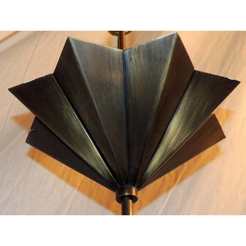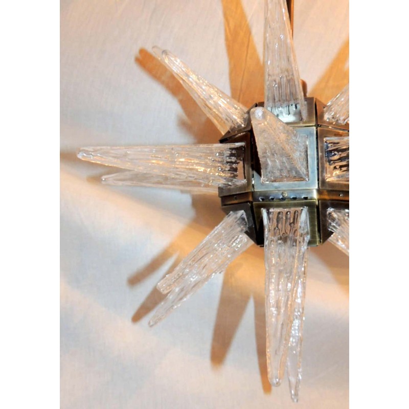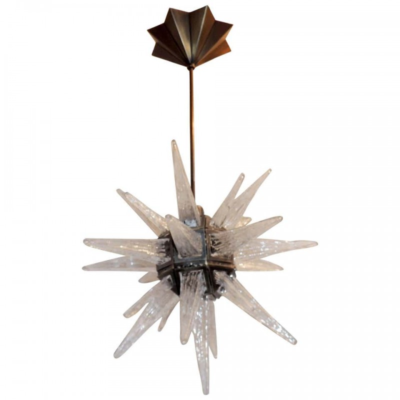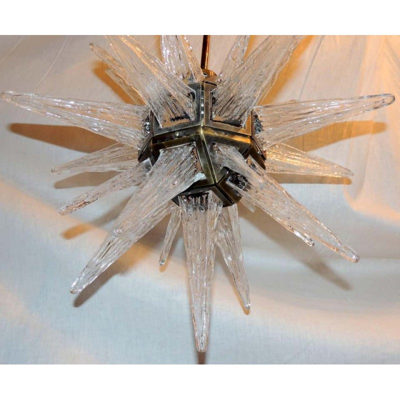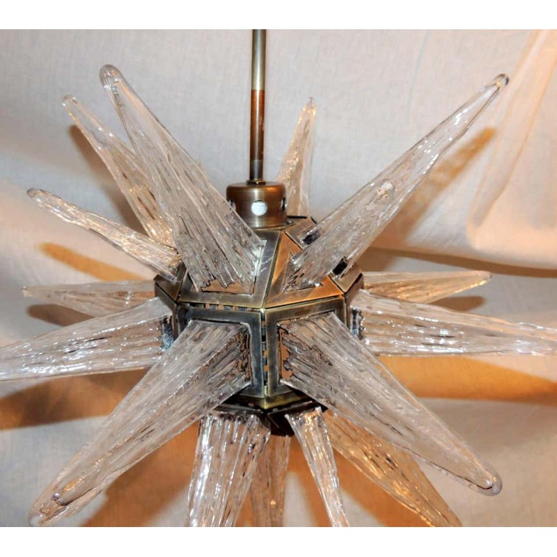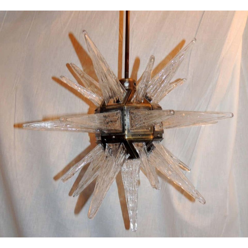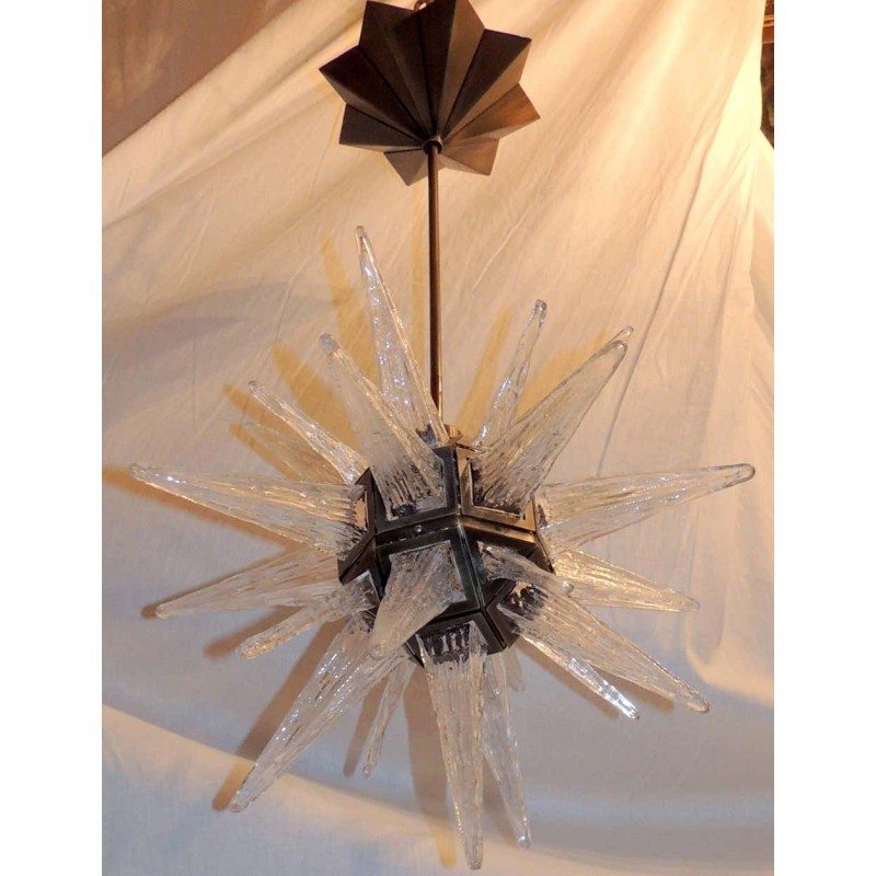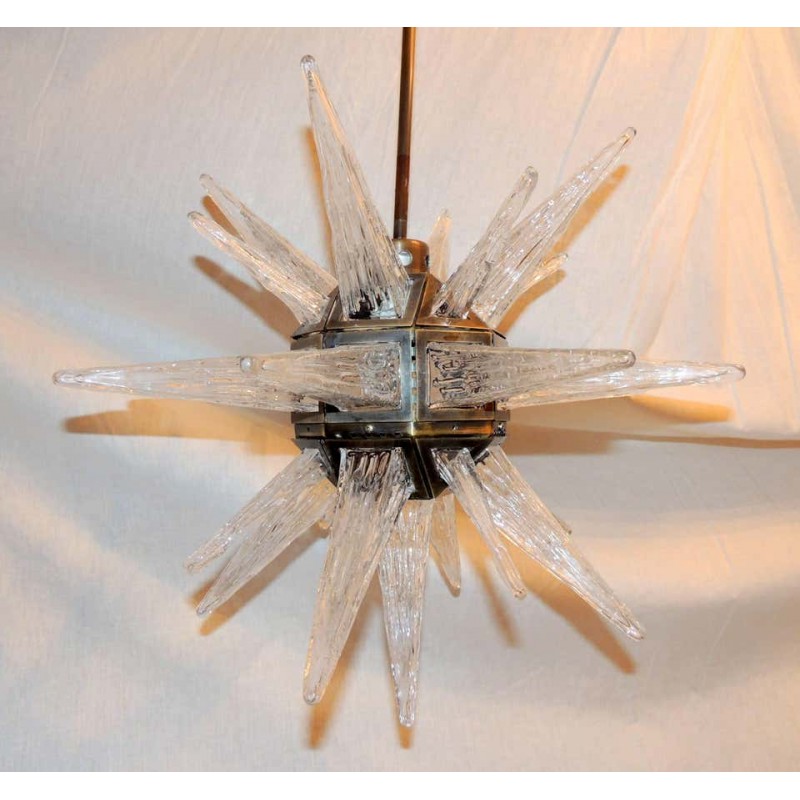 A wonderful vintage star form art glass chandelier fixture with antique bronze brass finished frame. The glass panels are in the form of shaped icicles. They had been removed out of a prominent Florida hotel, undergoing renovation. Measures 18" round without center rod and canopy. Rod can be replaced to your needs in length.