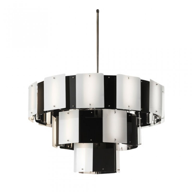 Bold and sculptural, the imposing design characterizing this three-tiered chandelier merges with the chromatic choice of black and white that lends it a sublime, timeless flair. The white opaline glass elements produce a captivating contrast with the black ones in mirrored glass. For an optimal spread of the light, sourced from the 21 LED strips (5W each) behind the glass tiles, a ballast of 24V is included with the chandelier that can be requested in various height options.