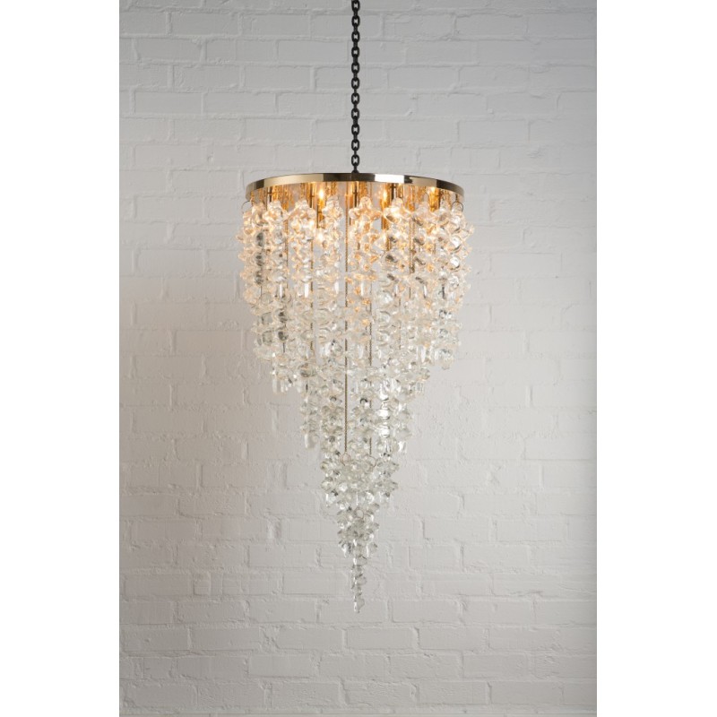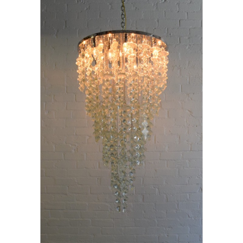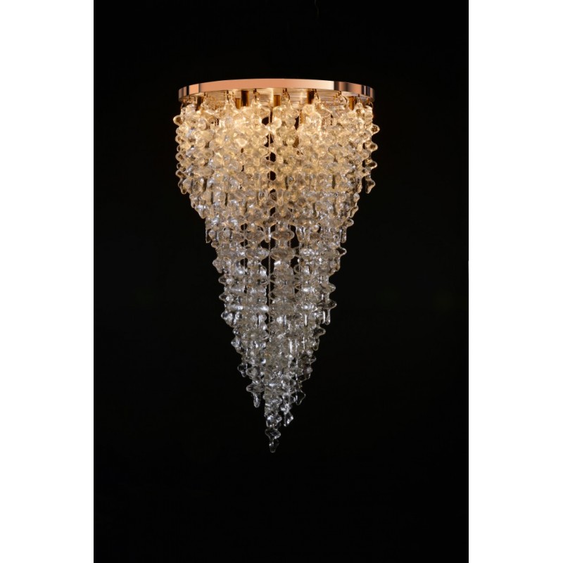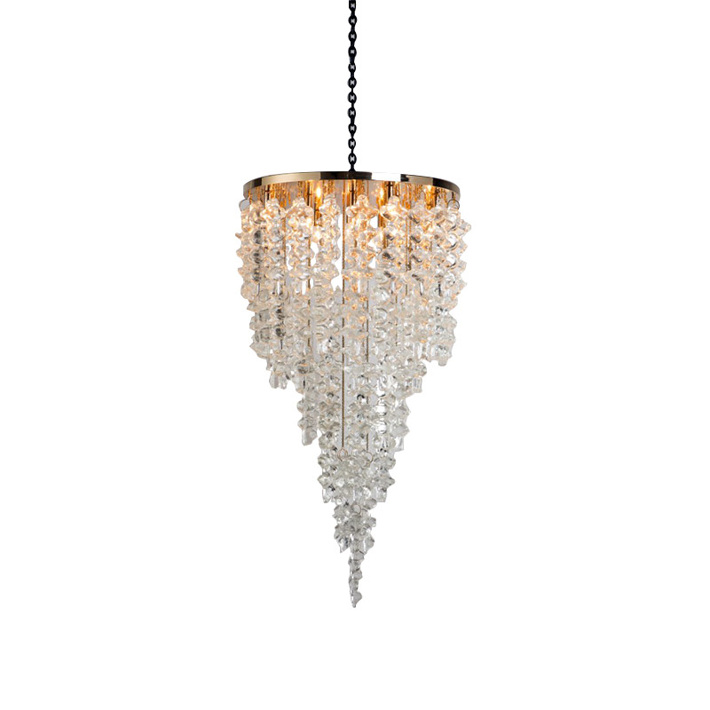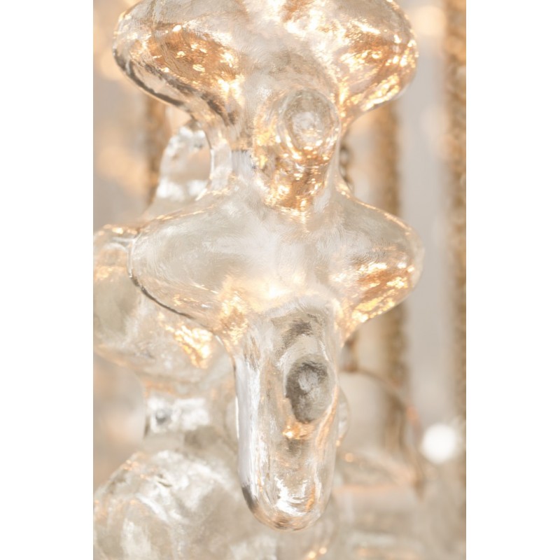 Tiers of organic Venetian glass elements, modeled after a brutalist sculpture, hang heavy yet light as air on strands of jewelers chain – like icicles melted in the winter sun and then frozen once more. Each Brutale glass piece, cast in quartz sand, glows with a fine molten texture and seeded bubbles that reveal the hand of the artist.