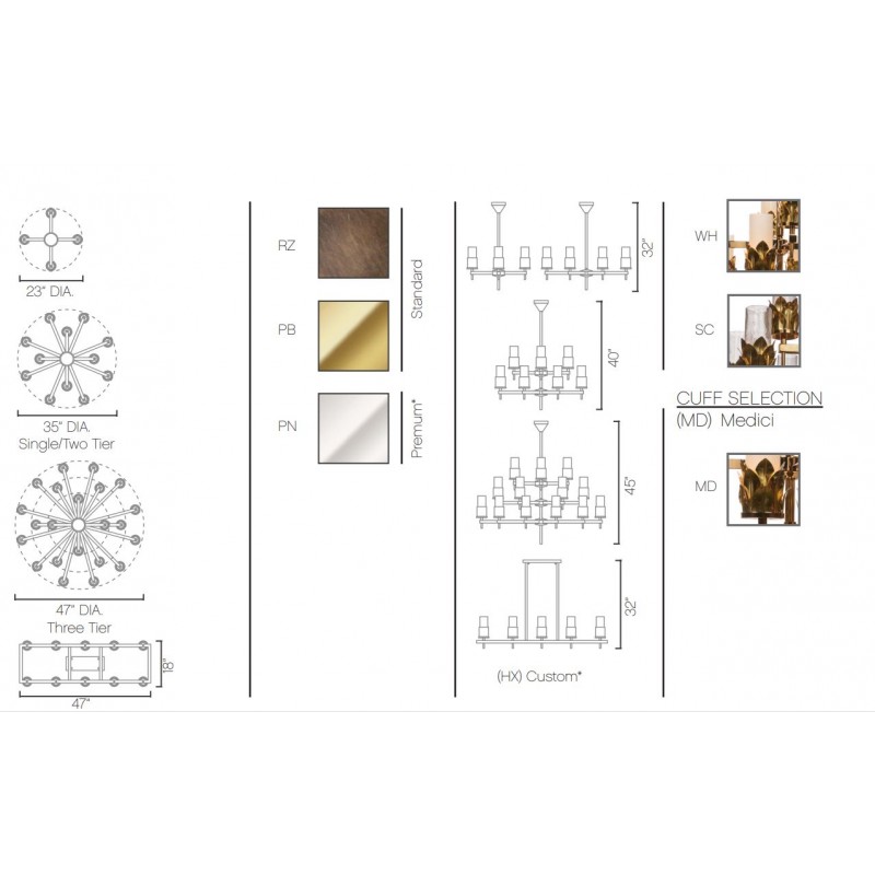 The modernist silhouette of the GIO single or multi-tiered frame juxtaposes with jewelry-inspired cuffs cradling hand blown frosted or seeded glass cylinders. The MEDICI cuff is a layered crown of hand formed modern acanthus leaves, completing a feature accent that melds architectural lines with an organic flair.