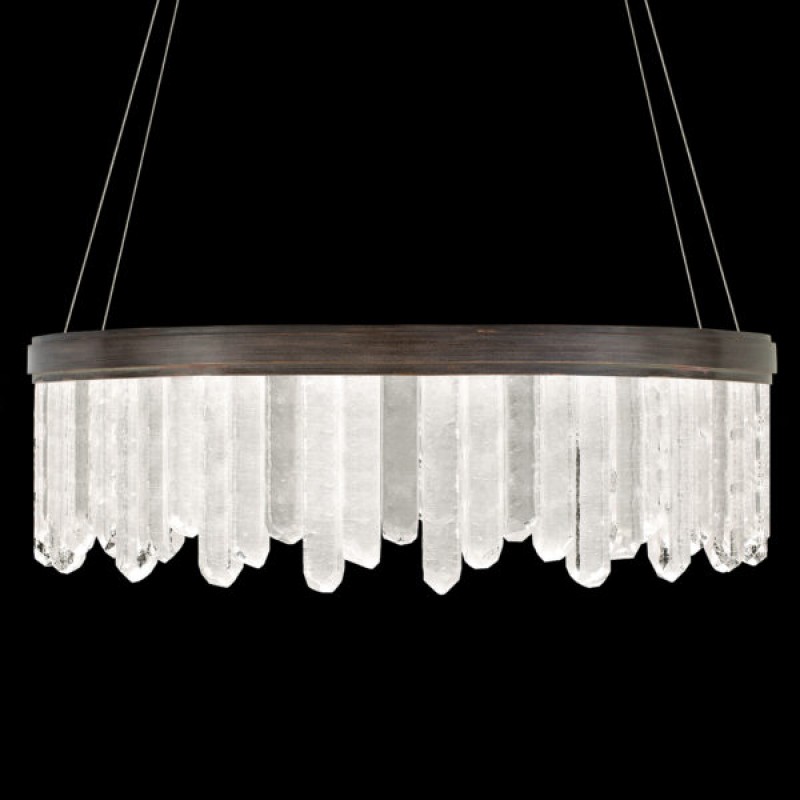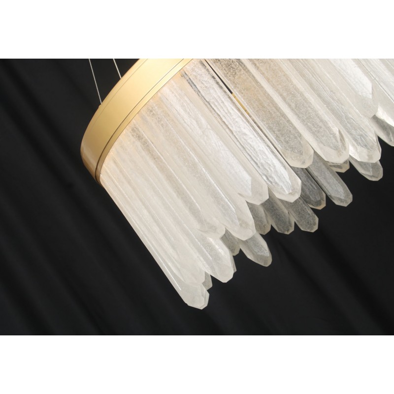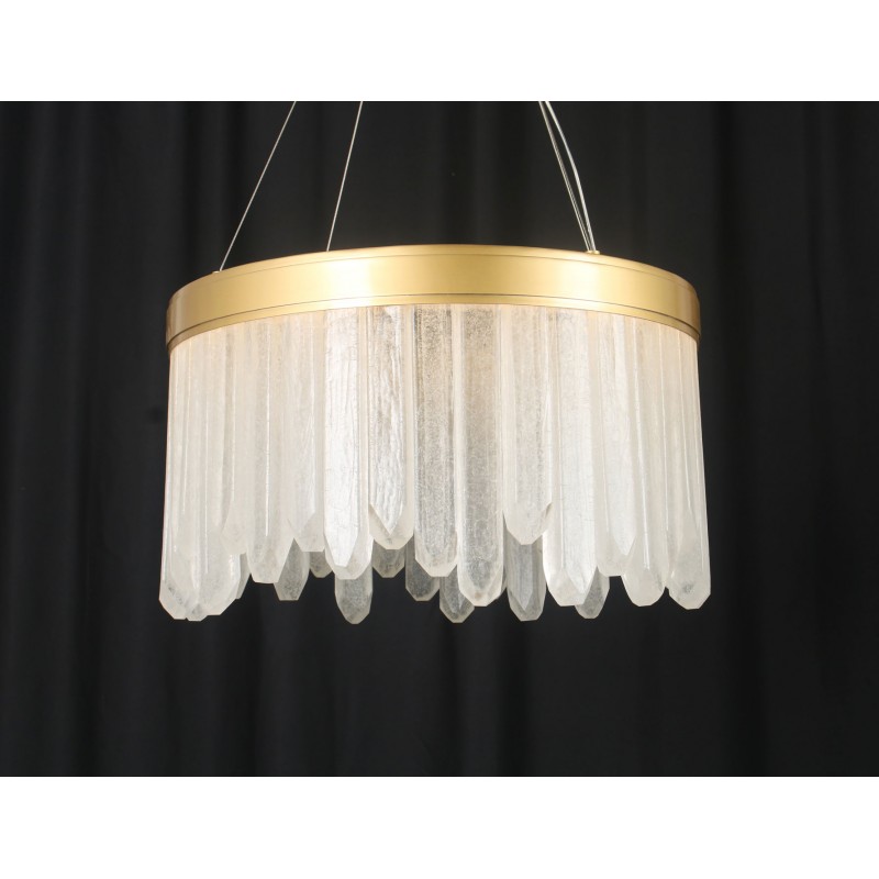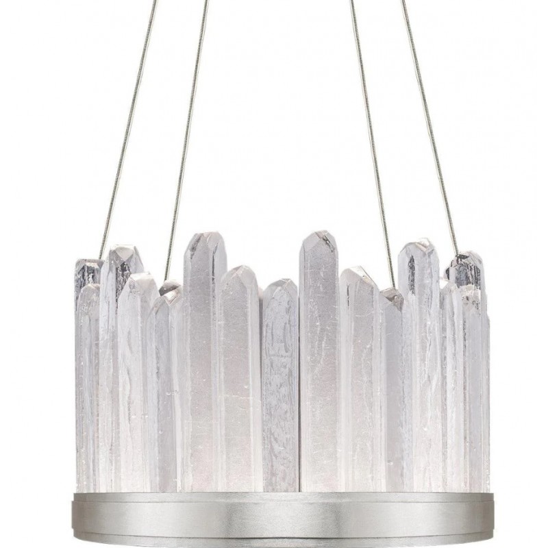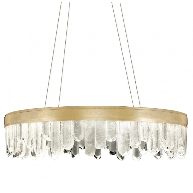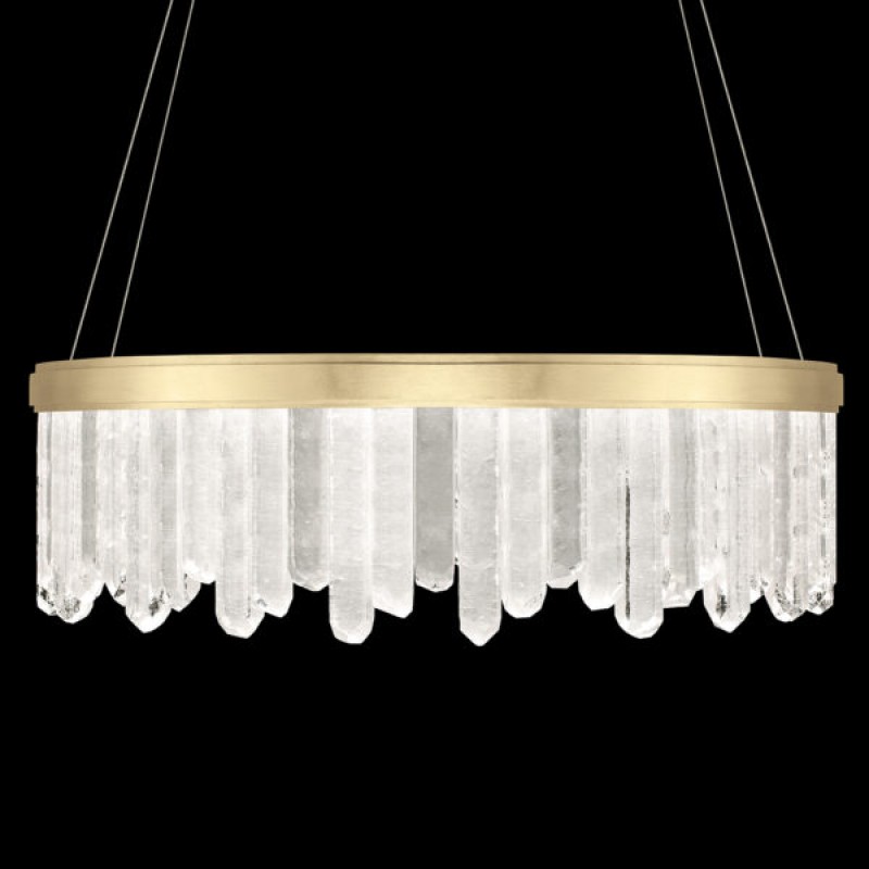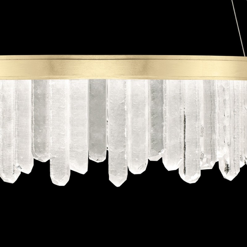 Reversible LED pendant influenced by the ephemeral appearance of illuminated rock crystal, which has been interpreted into handmade glass works with the collaboration of the Fine Art studio glass master craftsmen. Formed of glass spires that mimic natural crystal formations as much as they do rays of sunlight, and clean metal lines in unadorned but precious finishes. Available in silver leaf, gold leaf and patinated bronze.