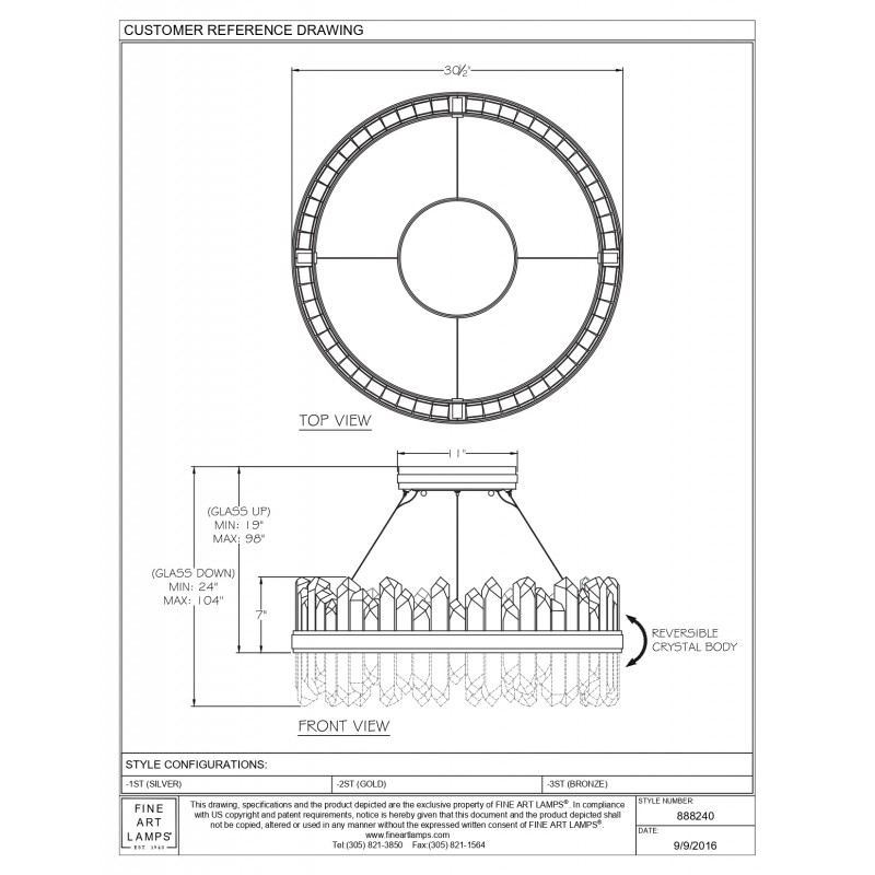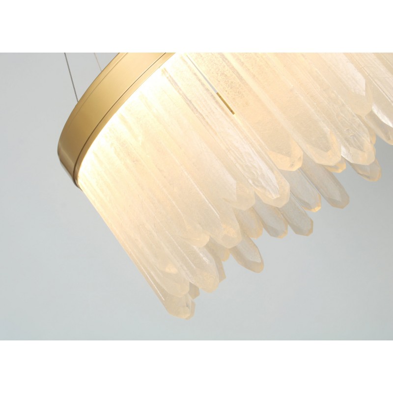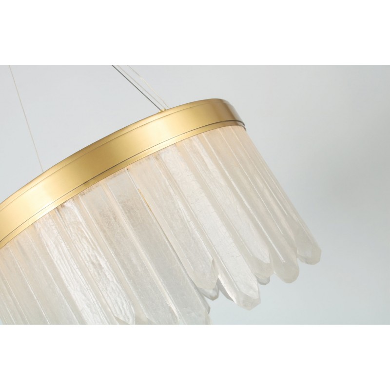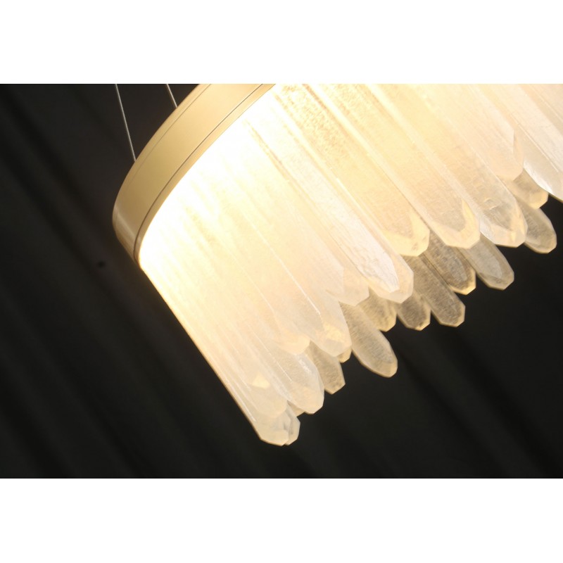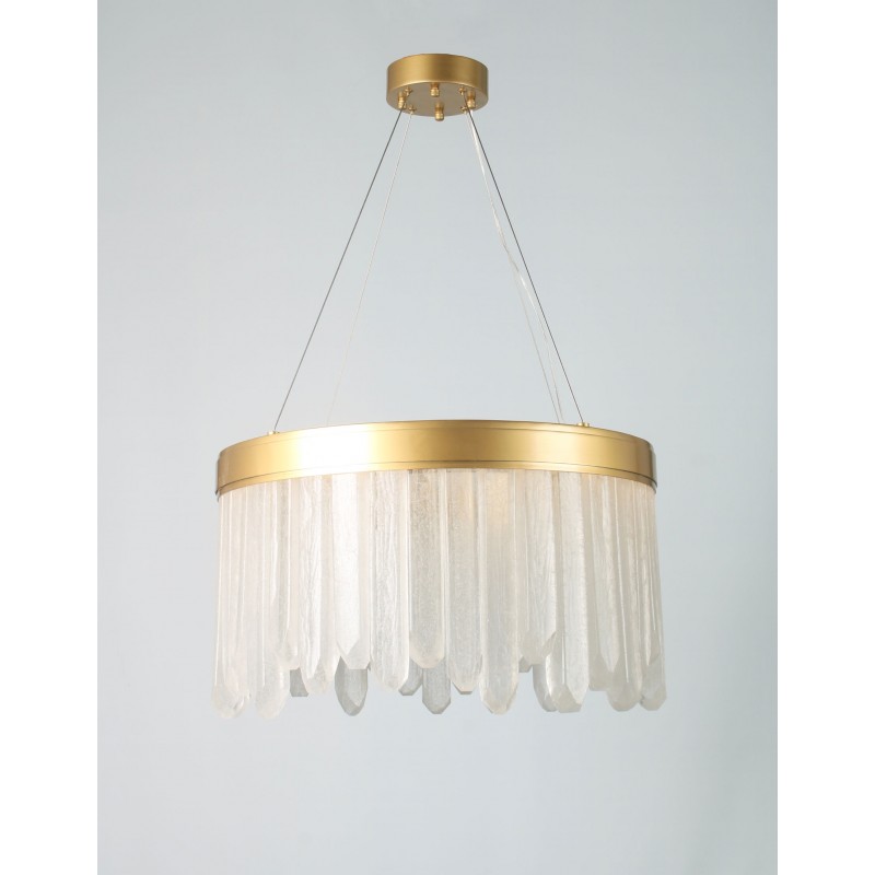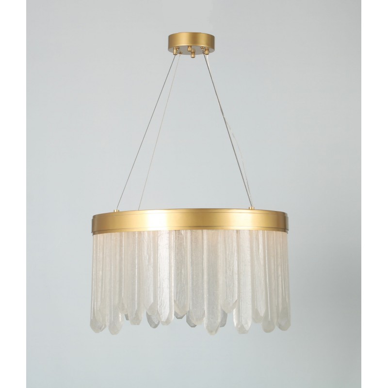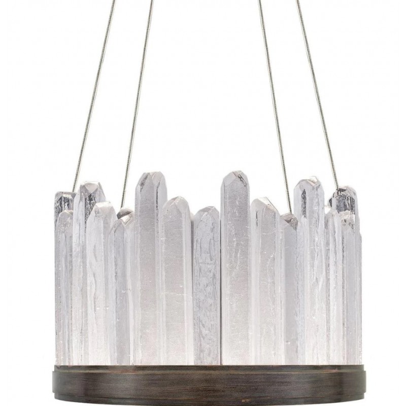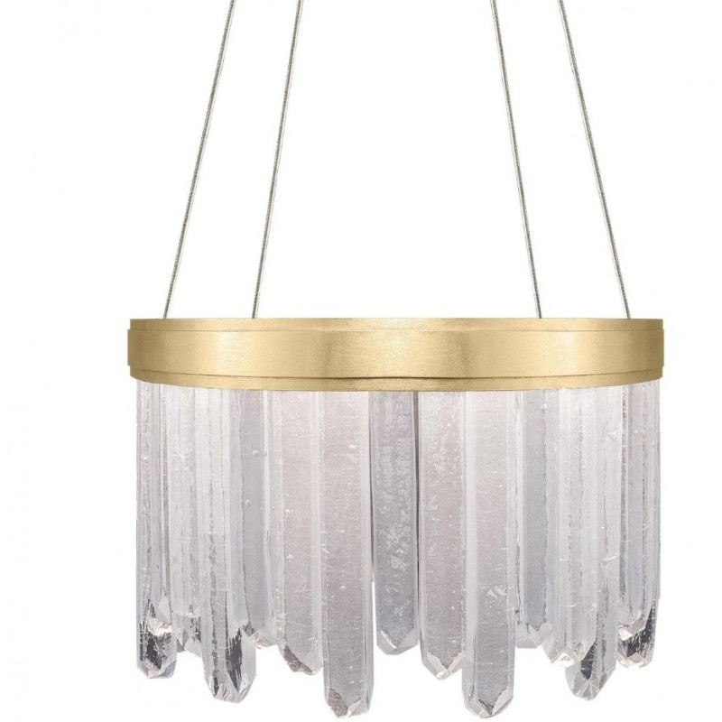Reversible LED pendant influenced by the ephemeral appearance of illuminated rock crystal, which has been interpreted into handmade glass works with the collaboration of the Fine Art studio glass master craftsmen. Formed of glass spires that mimic natural crystal formations as much as they do rays of sunlight, and clean metal lines in unadorned but precious finishes. Available in silver leaf, gold leaf and patinated bronze.