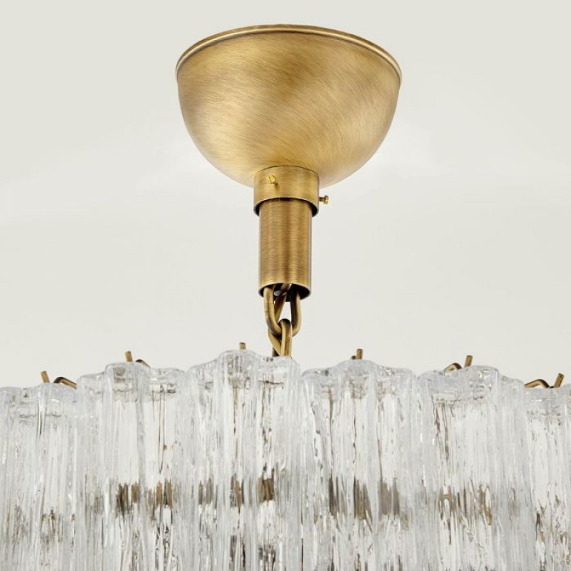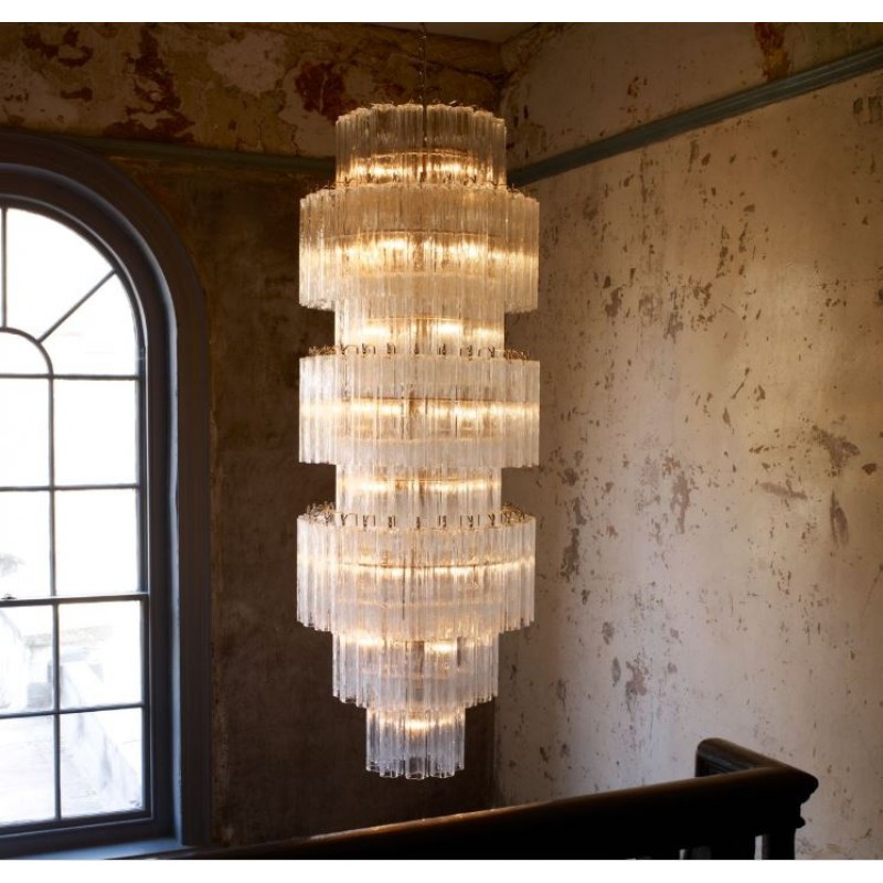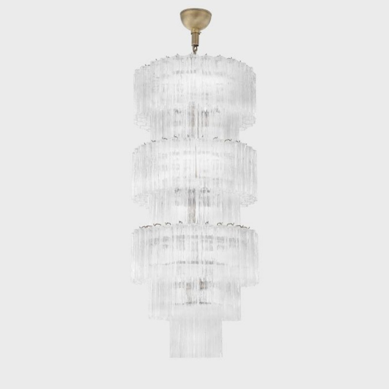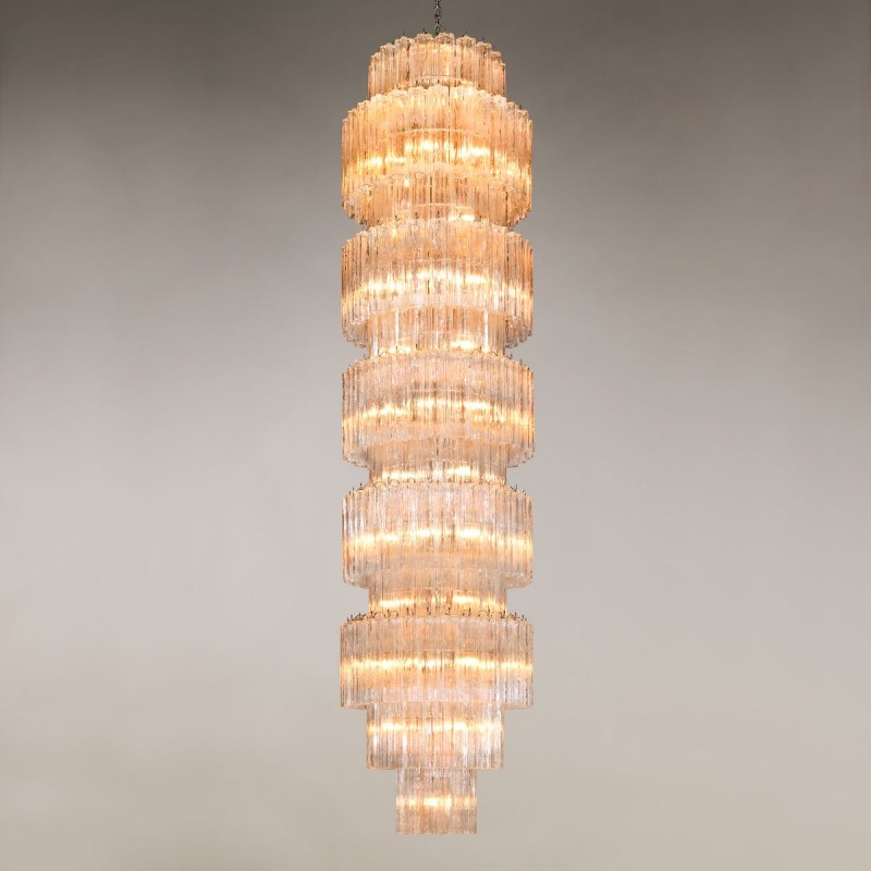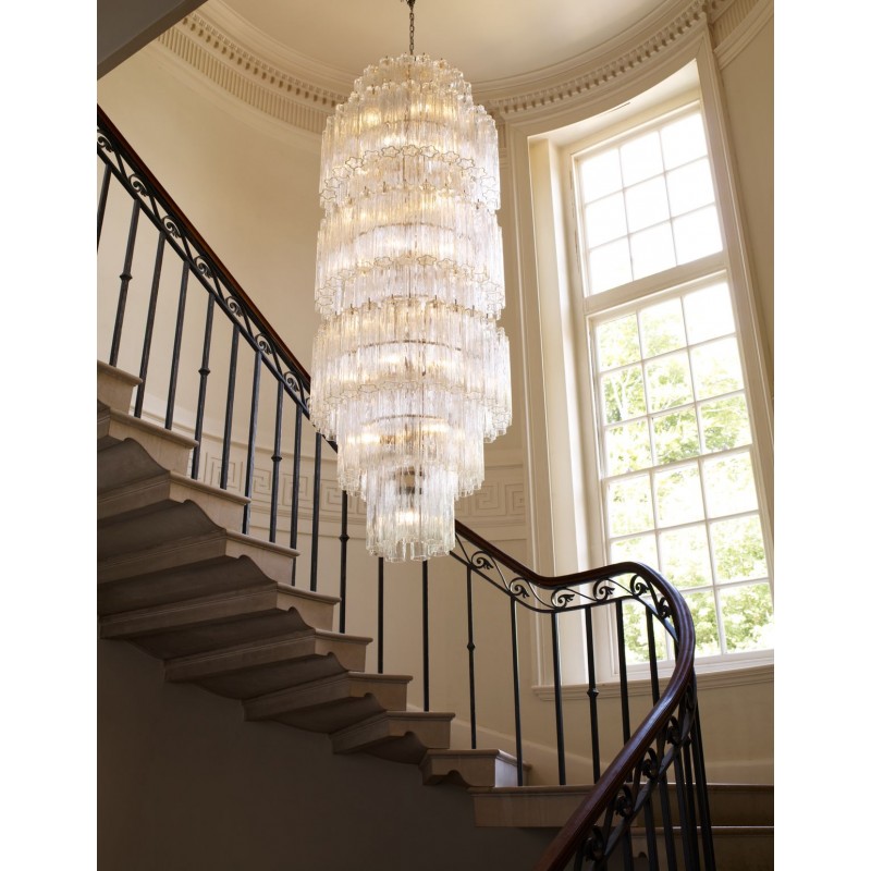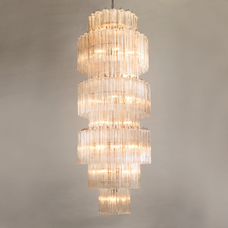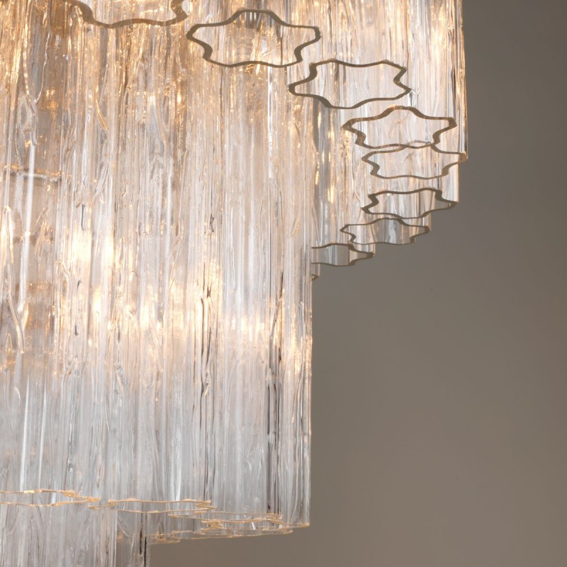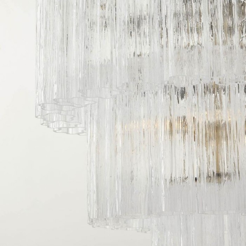 The chandelier is with a classic line, and hand-textured glass cylinders cascading from the frame to radiate and refract light. The tiers can be specified to produce the Chandelier in a variety of sizes. The glass is intricately molded and shaped to form ornate cylinders that cascade from the central frame. The strong and substantial frame is made from high-quality steel and plated in nickel.