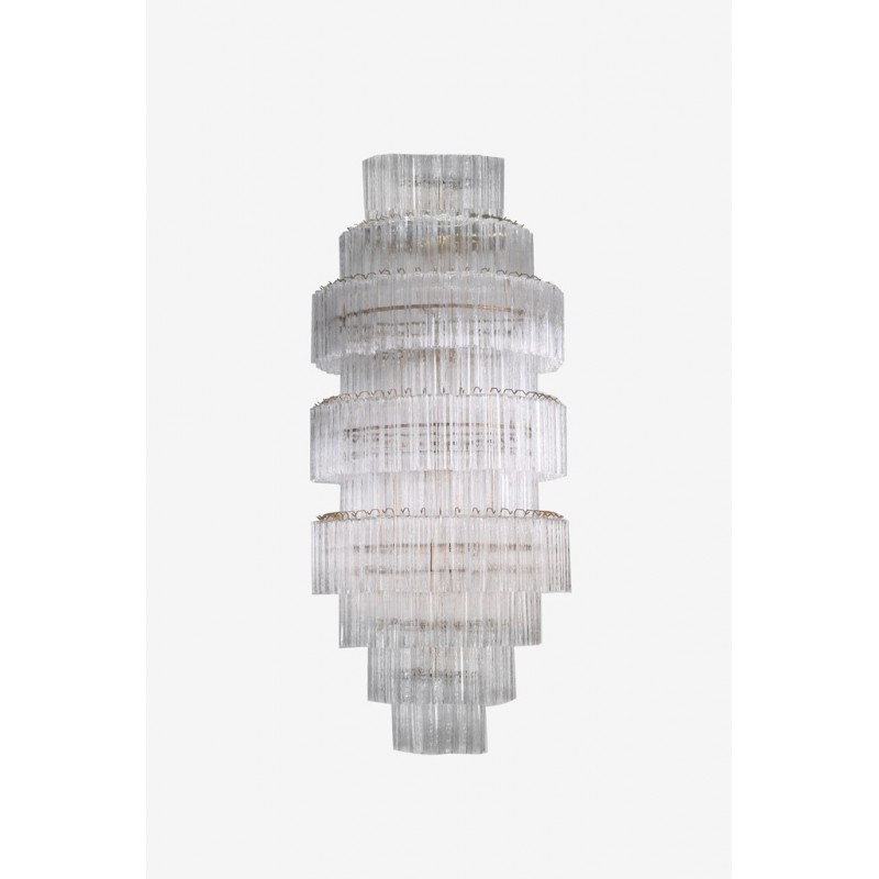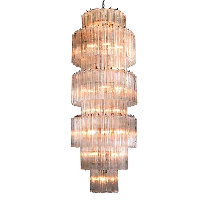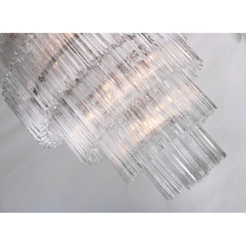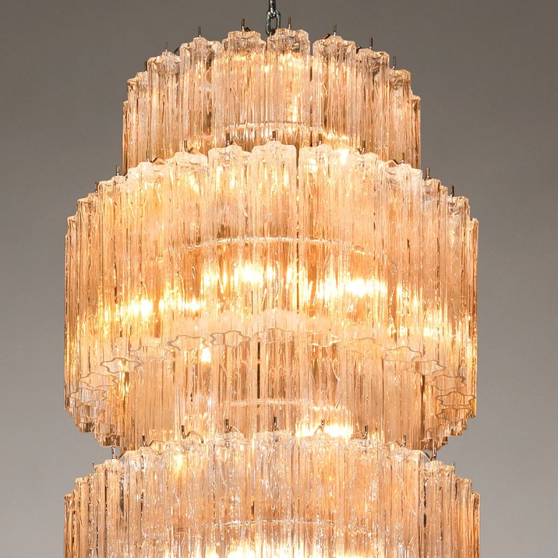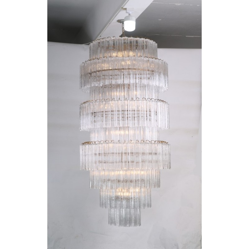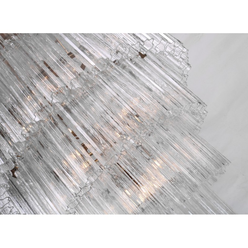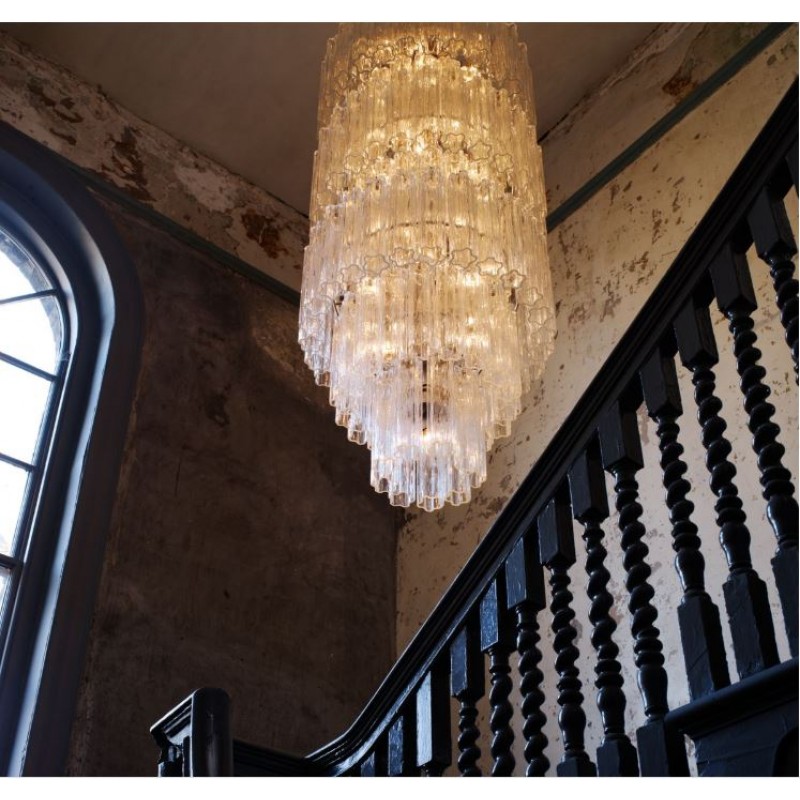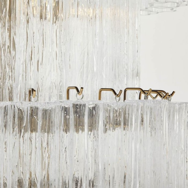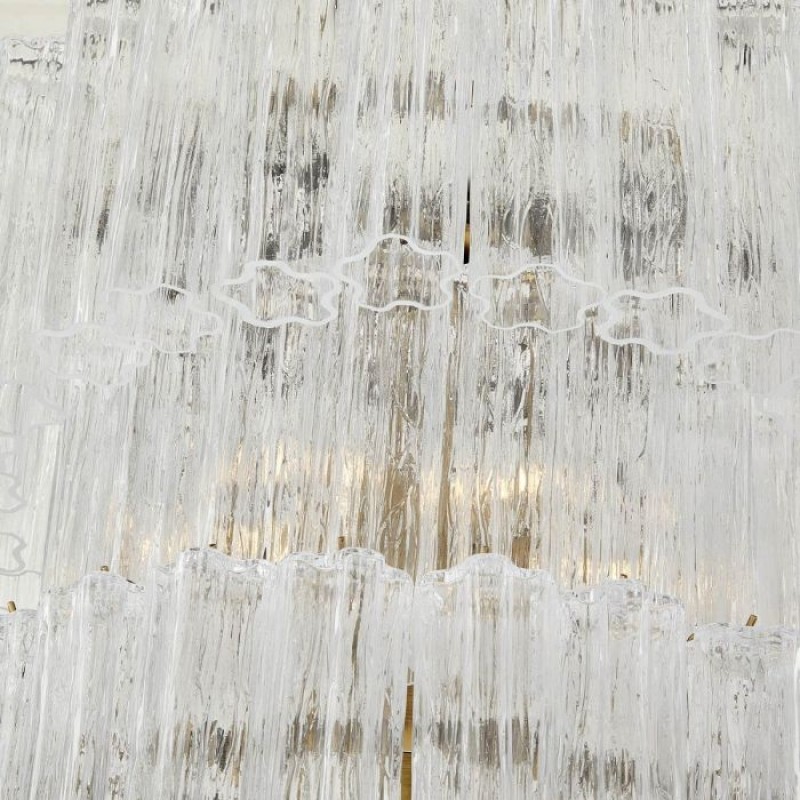The chandelier is with a classic line, and hand-textured glass cylinders cascading from the frame to radiate and refract light. The tiers can be specified to produce the Chandelier in a variety of sizes. The glass is intricately molded and shaped to form ornate cylinders that cascade from the central frame. The strong and substantial frame is made from high-quality steel and plated in nickel.