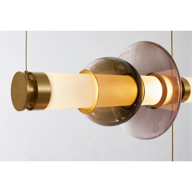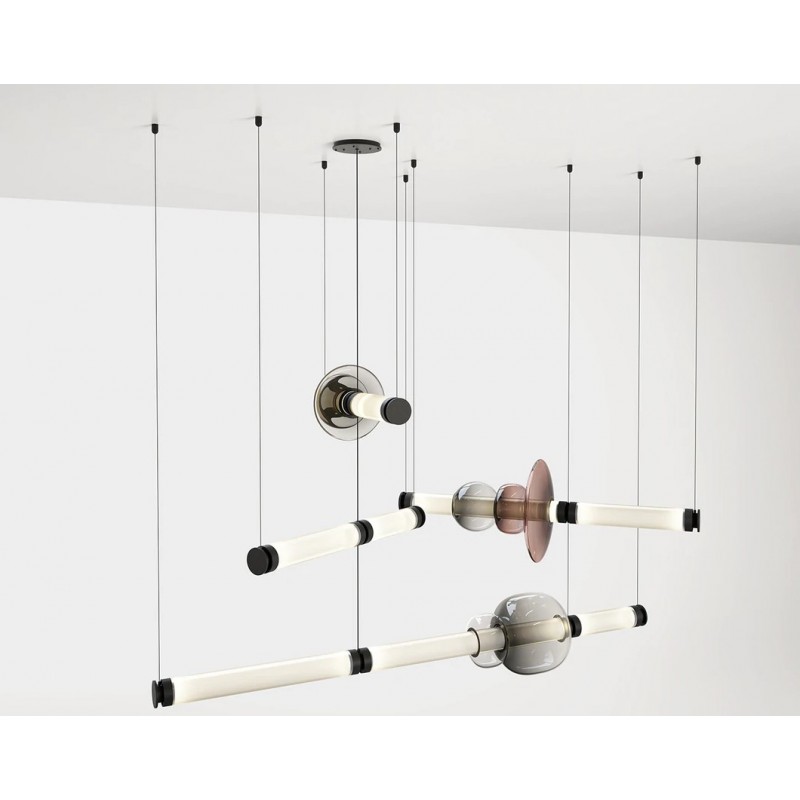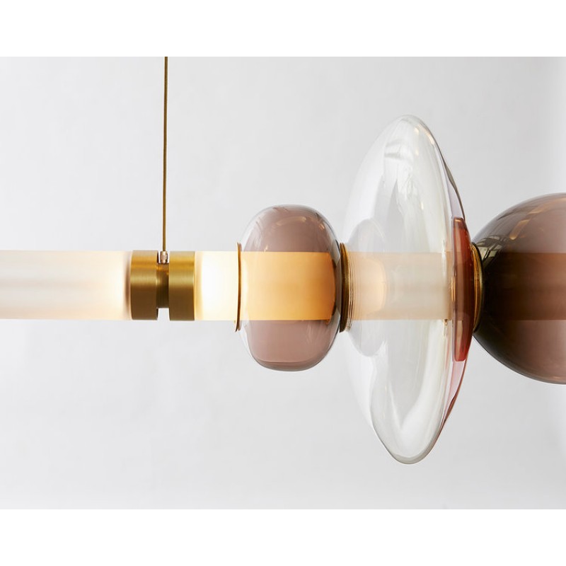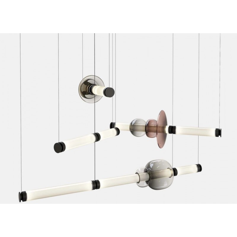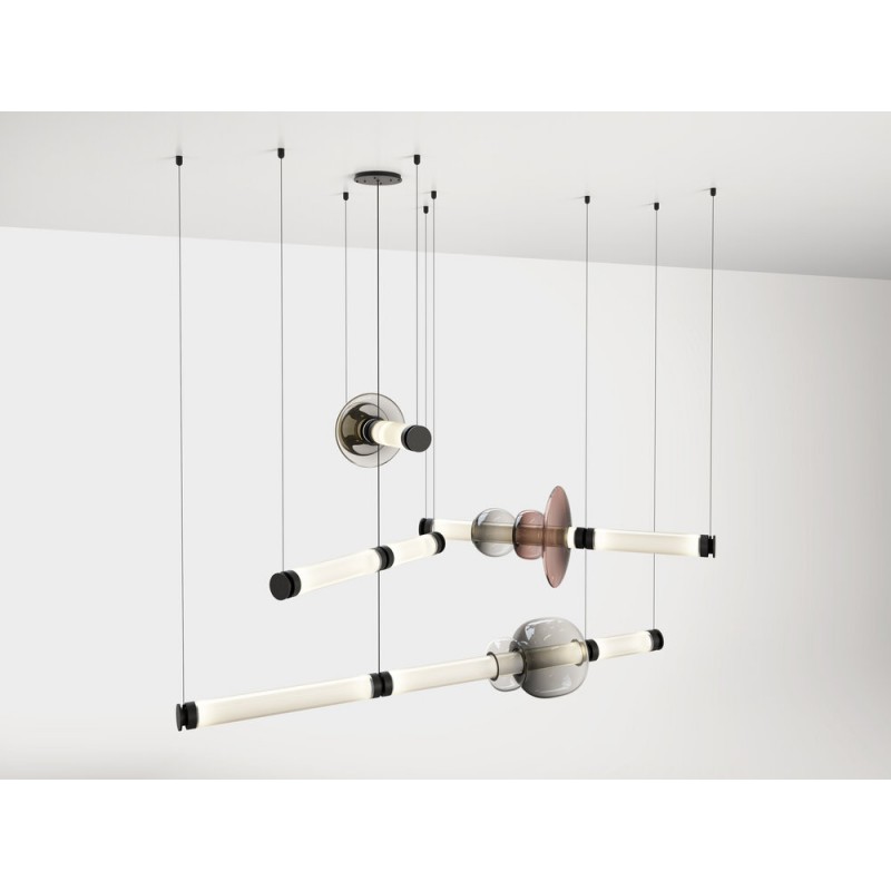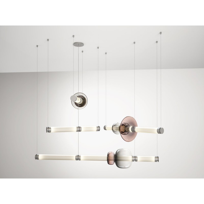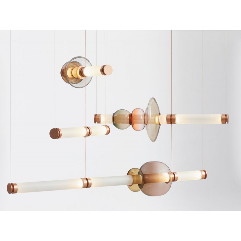 A lighting system with infinite interpretations, the LUNA is a synergy of color, shape, and refracted light. Inspired by a lunar halo, the modular light fixture grows in every direction as its assembly system stems horizontally or vertically, stacking color upon color of various blown glass shapes. The LUNA series is a glamorous reference to the moon’s diffused light and a soft glow. Allusive yet glamorous, the LUNA is a new tradition in glass-work and light form. Available in a variety of colors and shapes, LUNA is a highly customizable fixture.