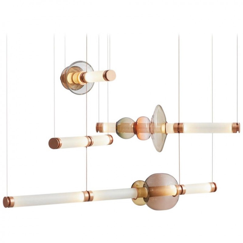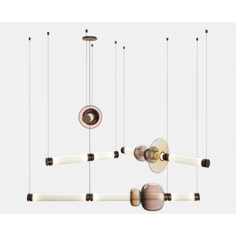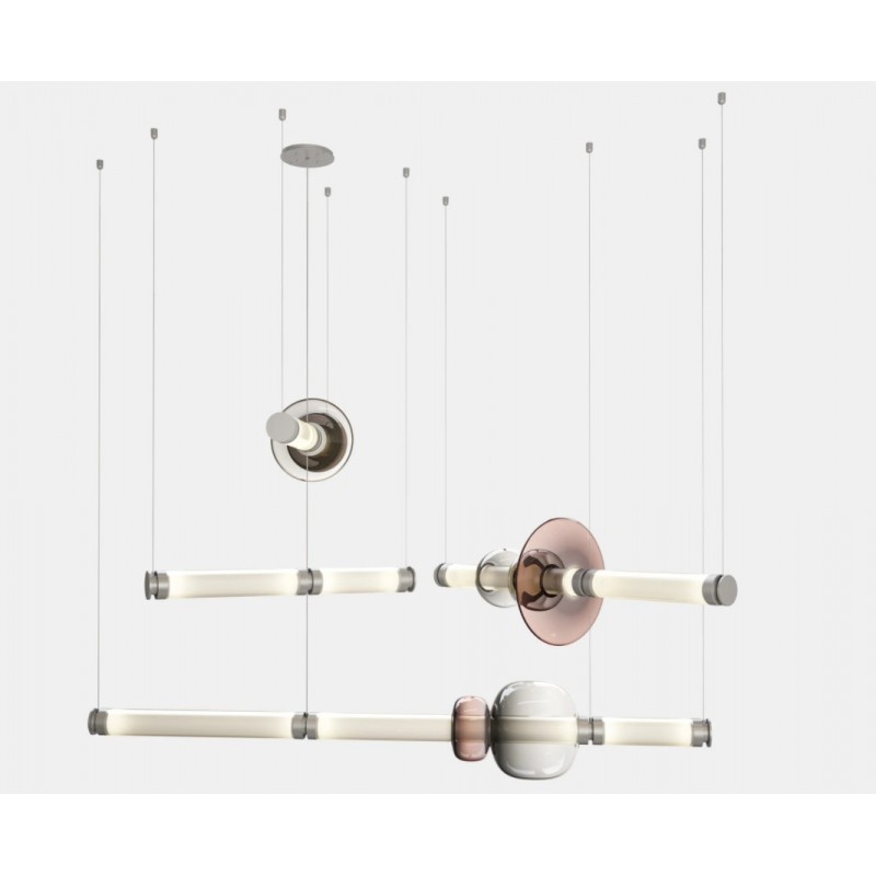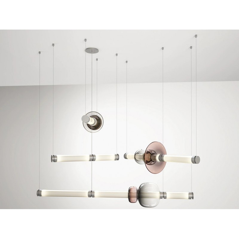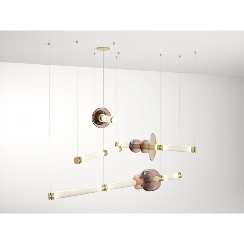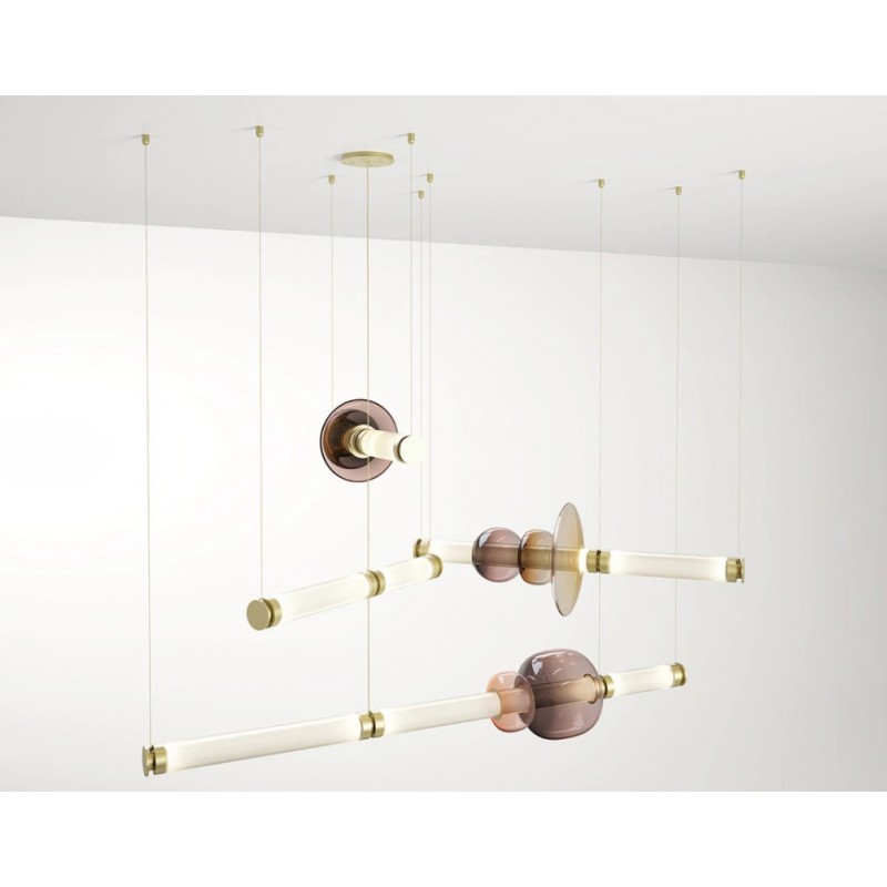 A lighting system with infinite interpretations, the LUNA is a synergy of color, shape, and refracted light. Inspired by a lunar halo, the modular light fixture grows in every direction as its assembly system stems horizontally or vertically, stacking color upon color of various blown glass shapes. The LUNA series is a glamorous reference to the moon’s diffused light and a soft glow. Allusive yet glamorous, the LUNA is a new tradition in glass-work and light form. Available in a variety of colors and shapes, LUNA is a highly customizable fixture.